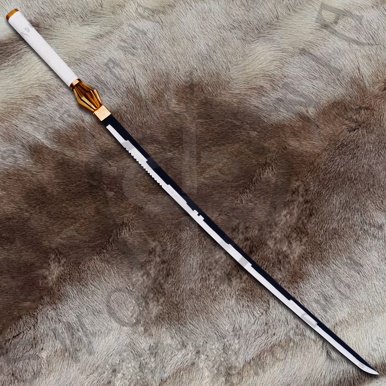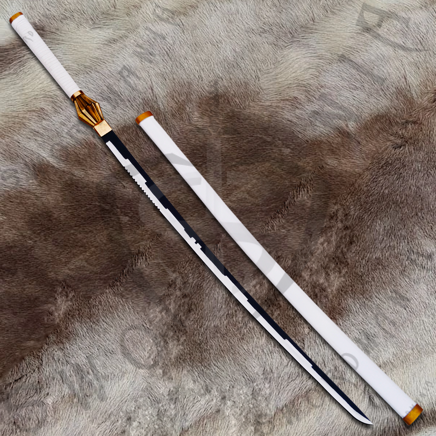 This is a full-scale 39inch replica of Nozarashi, of Kenpachi Zaraki’s Zanpakuto from Bleach. Featuring a 30inch rugged, forged blade and an 9inch wrapped handle, it’s available in both high-performance and display-grade steel options. This replica includes a robust scabbard and a specially designed wooden plaque that mirrors the raw and brutal aesthetic seen in the series.