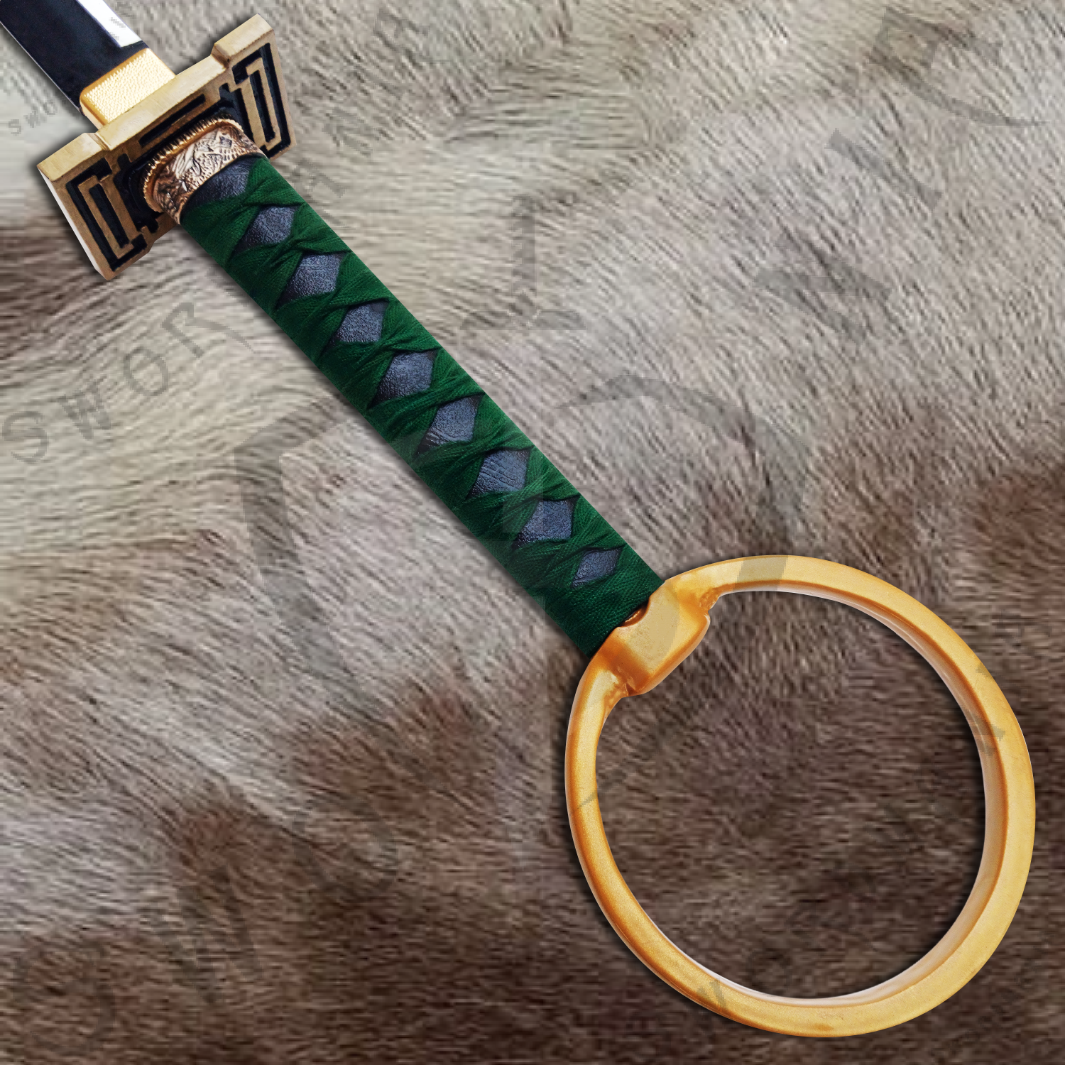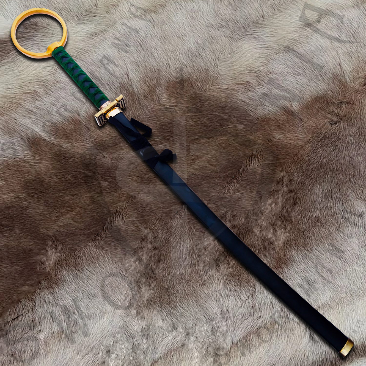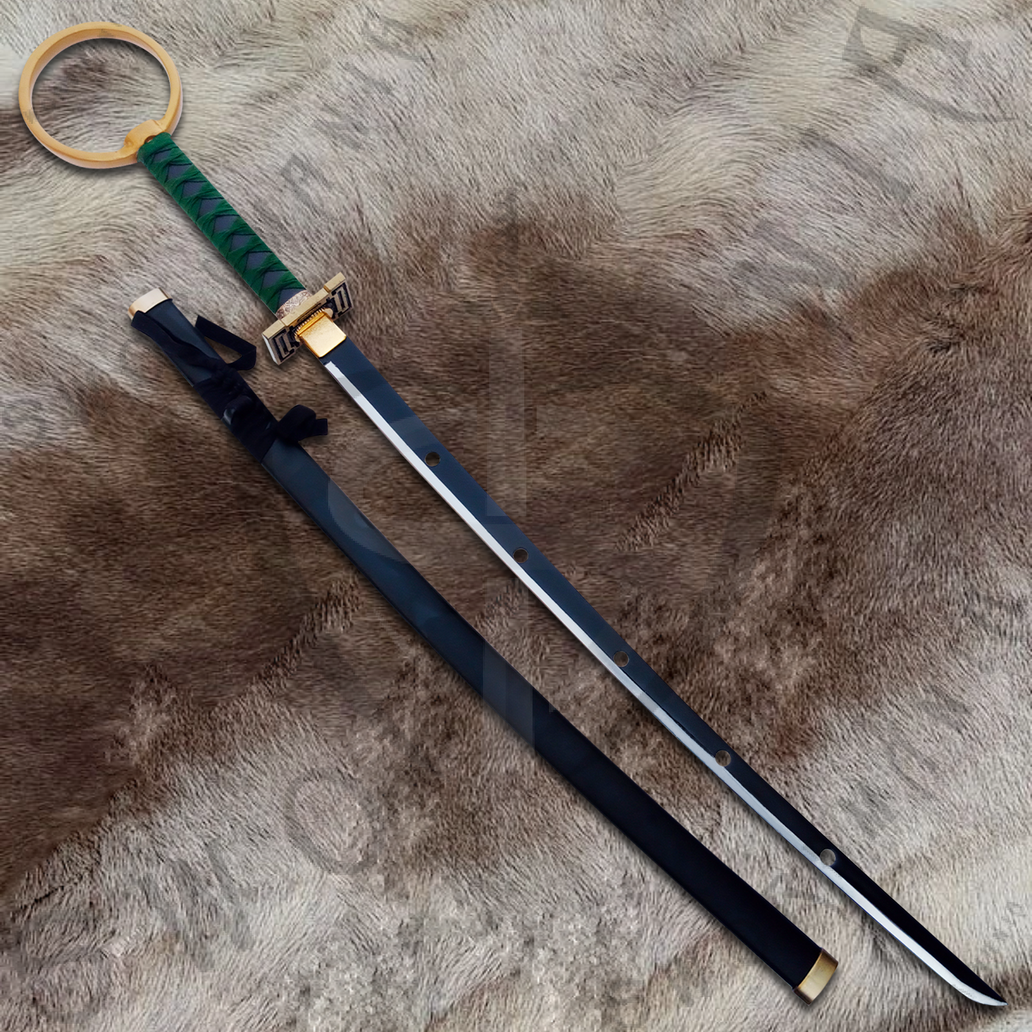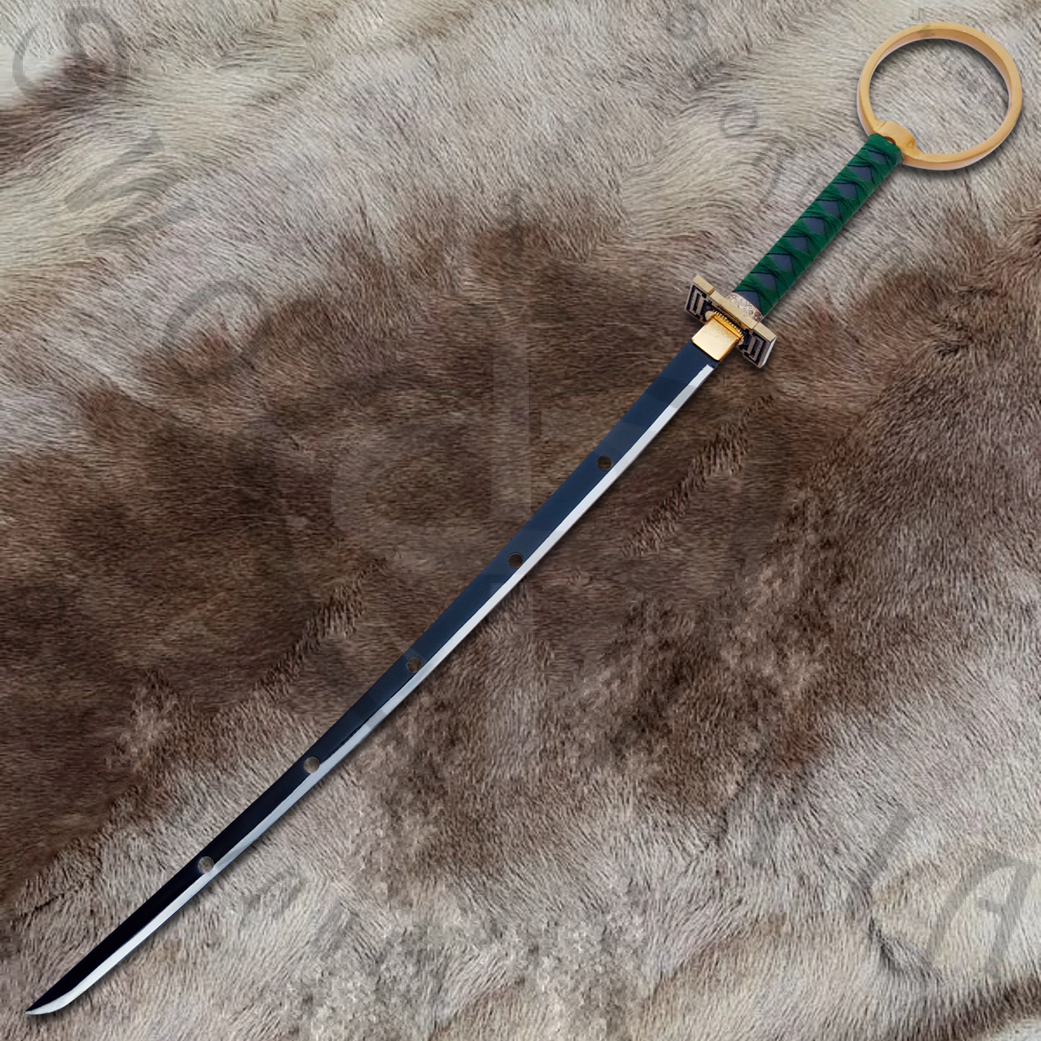 This is a full scale 39inch replica of Sakanade, the hypnotic and visually striking Zanpakutō of Shinji Hirako from Bleach. Featuring a 30inch mirror polished blade and a 9inch handle wrapped in green cord with a ring on its top, this piece is available in both performance ready and display focused steel variants. It includes a custom scabbard and a uniquely designed wooden plaque capturing Sakanade’s twisted elegance and disorienting charm.