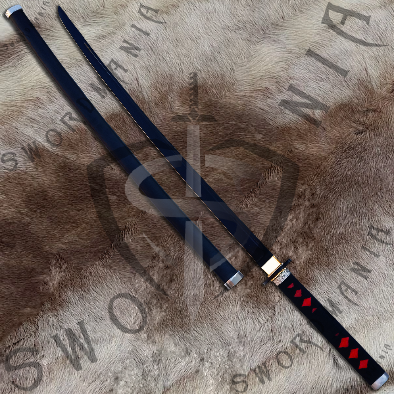 This is a full scale, 41inch full tang replica sword of Tanjiro Kamado Nichirin from Demon Slayer, a marvelous adventure series of Kimetsu No Yaiba, that has forged blade available in various steel types with cosplay style construction and functional style construction. The blade is all black and hand wrapped cord on the handle. Tanjiro Sword have wooden plaque and scabbard.