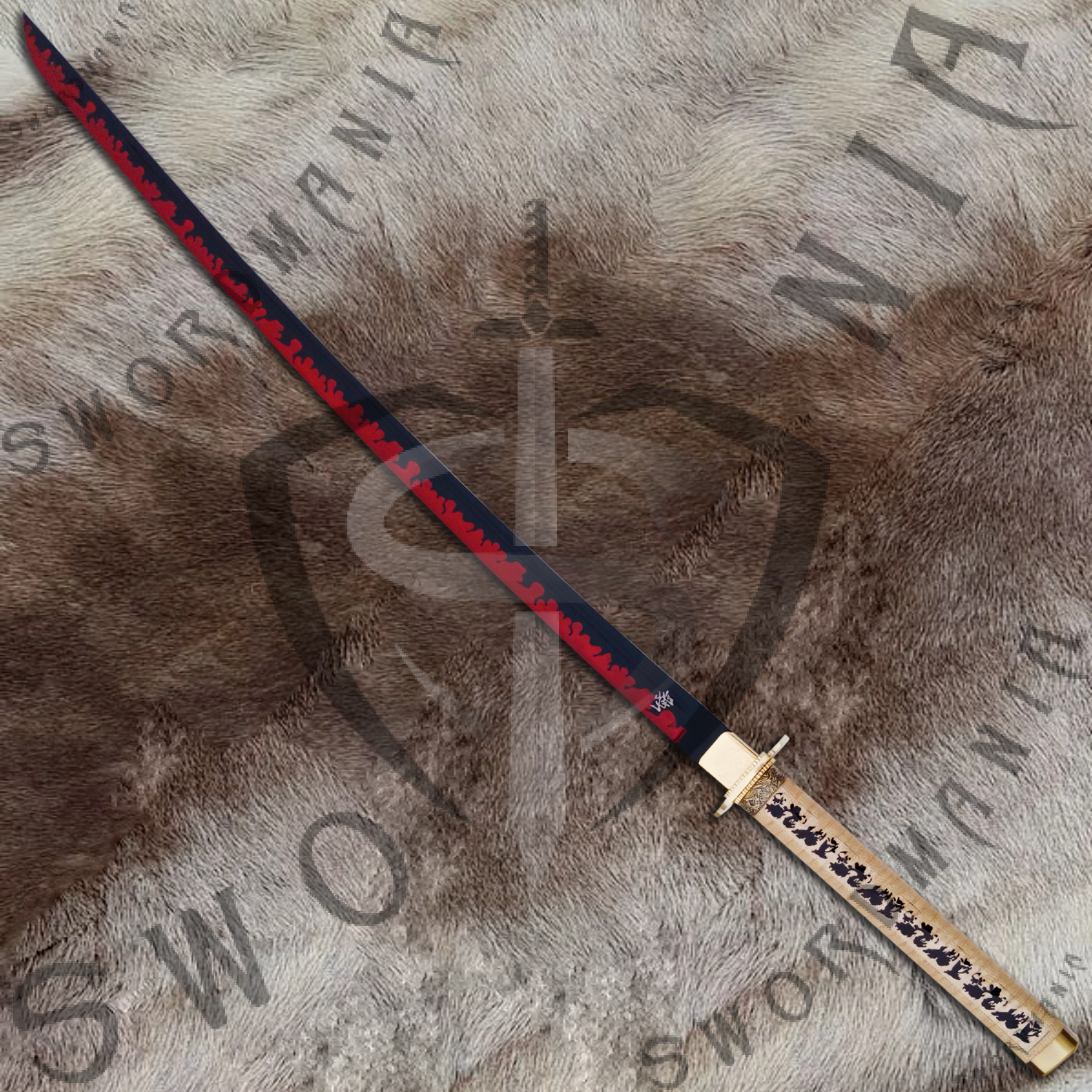 This is a full scale, 41inch full tang replica sword of Yoriichi Tsugikuni Nichirin from Demon Slayer, a marvelous adventure series of Kimetsu No Yaiba, that has forged blade available in various steel types with cosplay style construction and functional style construction. The blade has Red hamon and hand wrapped cord on the handle with runic inscription. Yoriichi Sword have wooden plaque and scabbard.