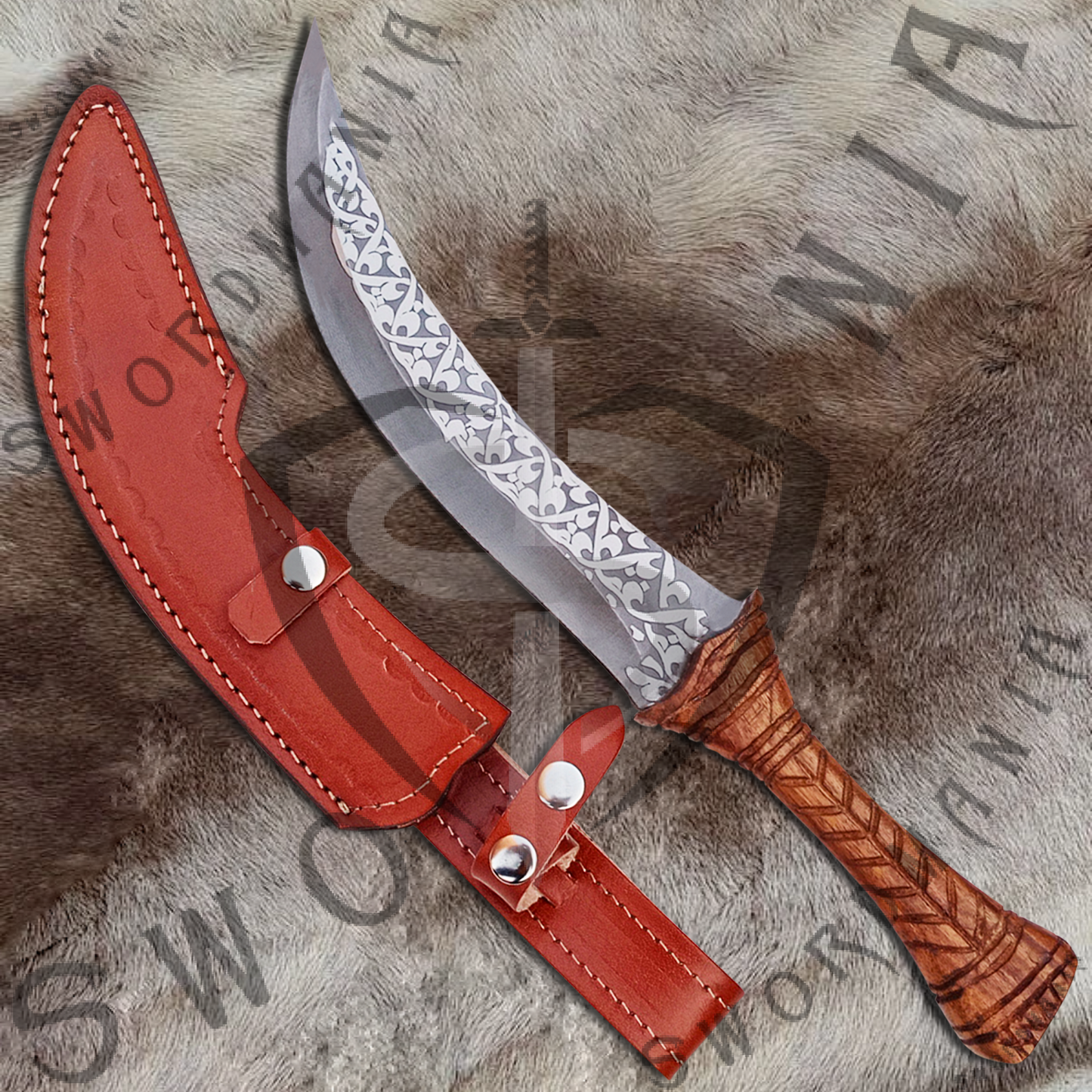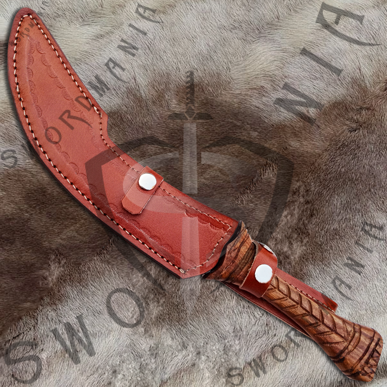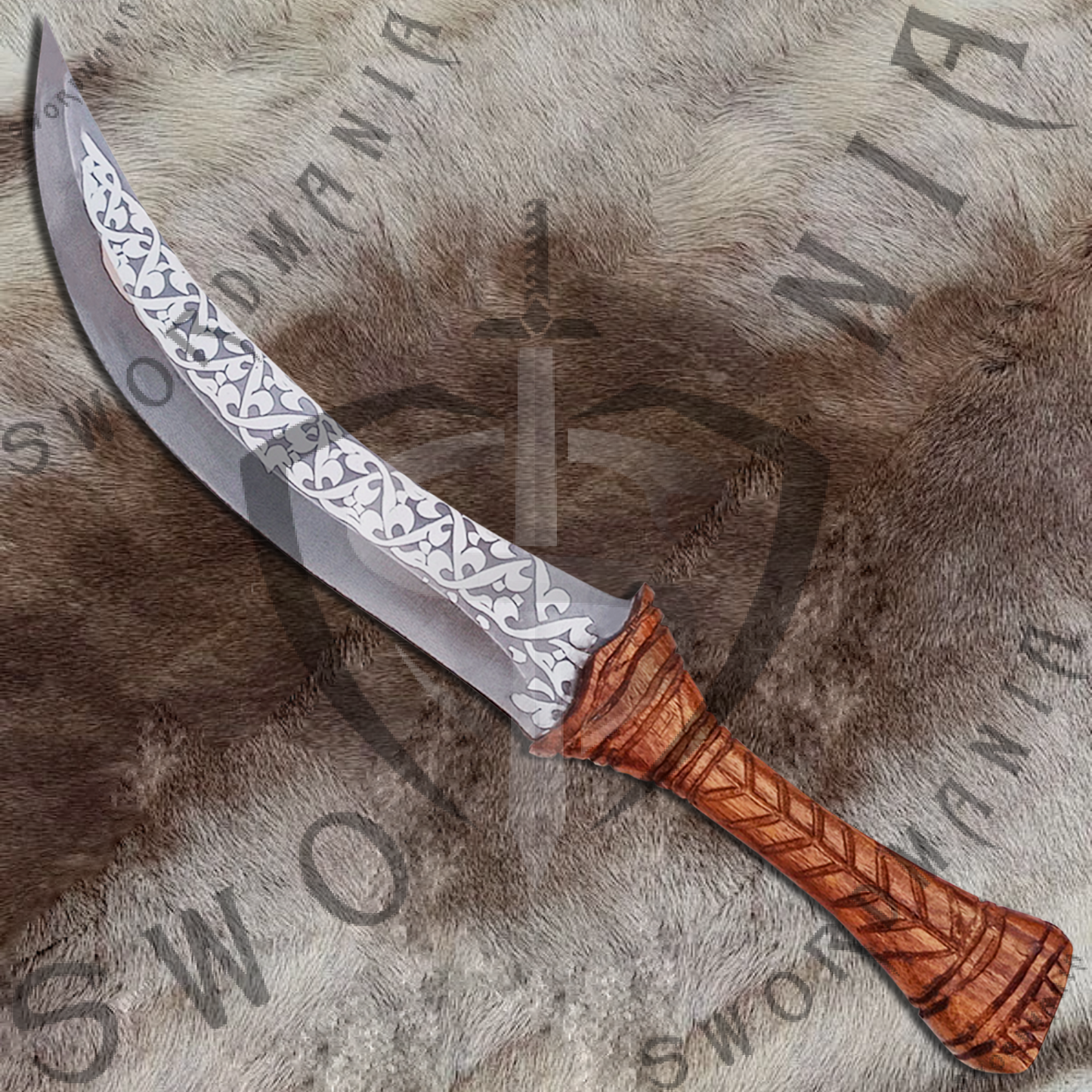This is a full scale Erdsteel from Elden Rings, a prominent and distinctive name in the world of gaming. The knife has a forged blade available in variety of steel types with cosplay style construction and functional style construction. The knife also comes with leather scabbard and a wooden stand concurrent with the design of the knife and its finish.