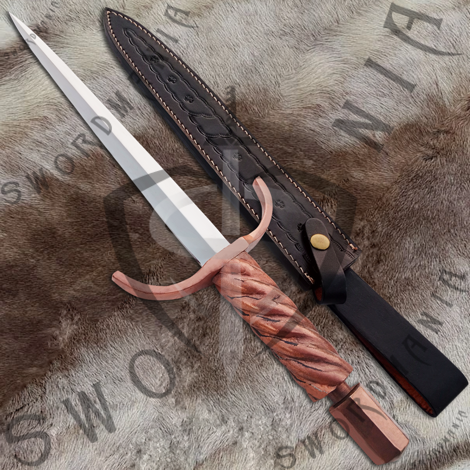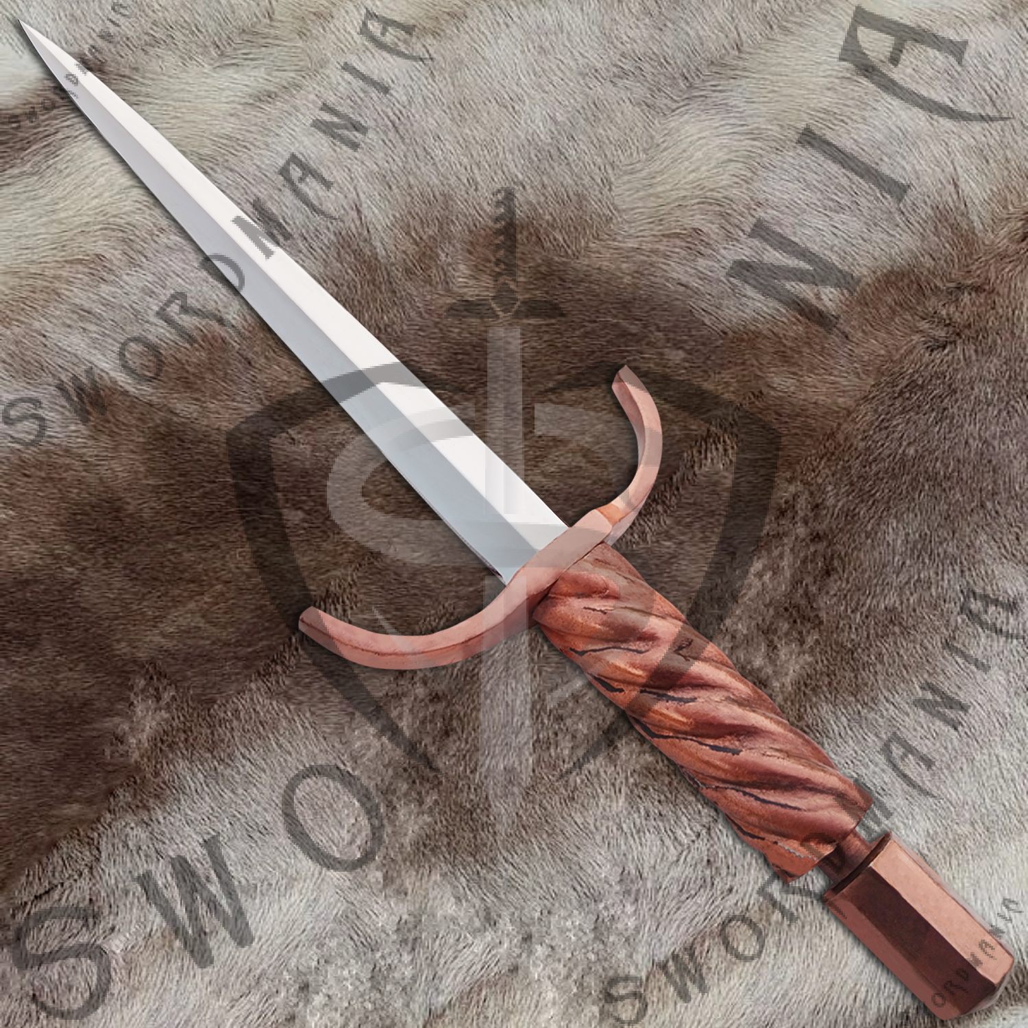 This is a full scale Parrying Knife from Elden Rings, a prominent and distinctive name in the world of gaming. The knife has a forged blade available in variety of steel types with cosplay style construction and functional style construction. The knife also comes with leather scabbard and a wooden stand concurrent with the design of the knife and its finish.