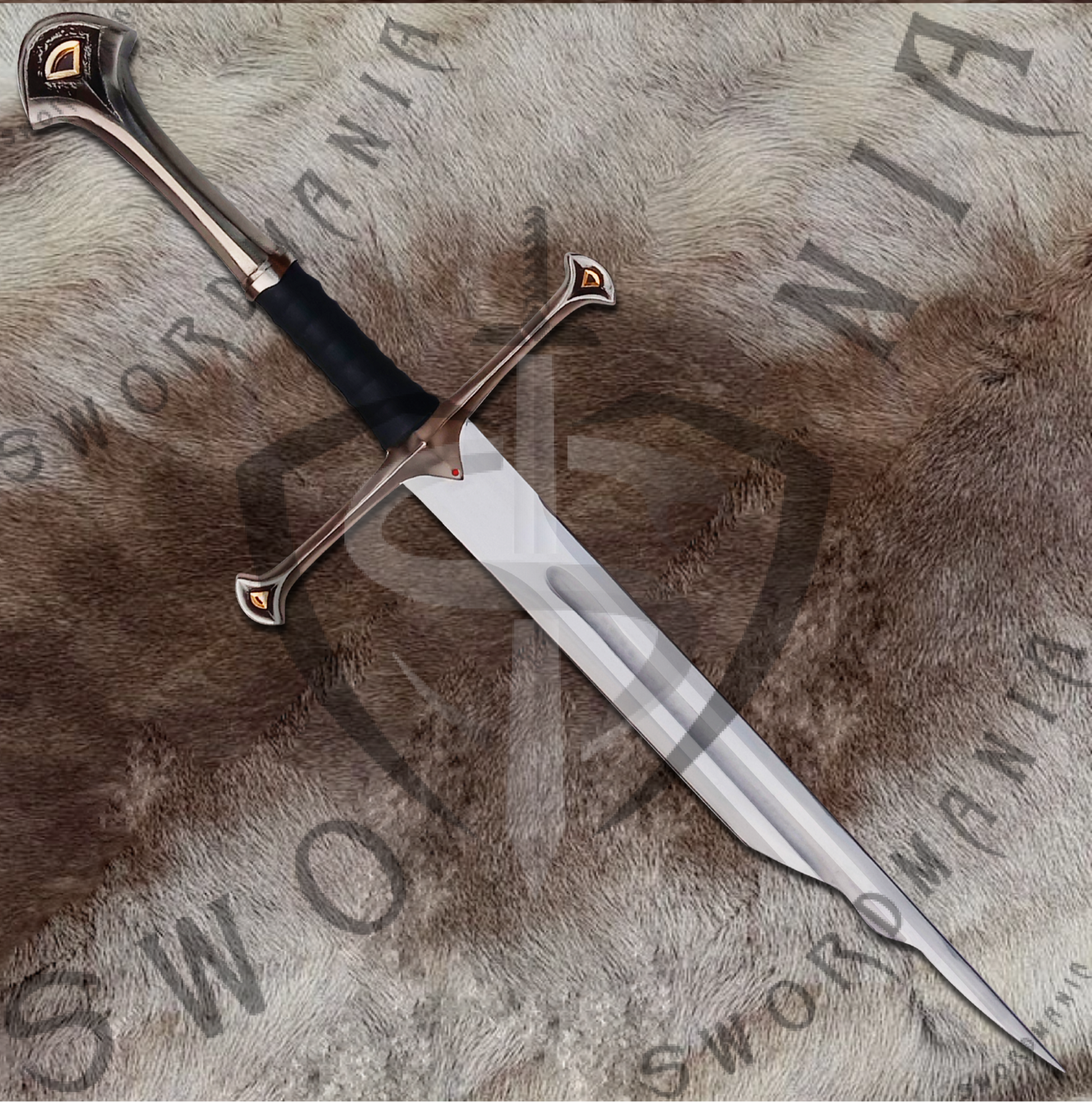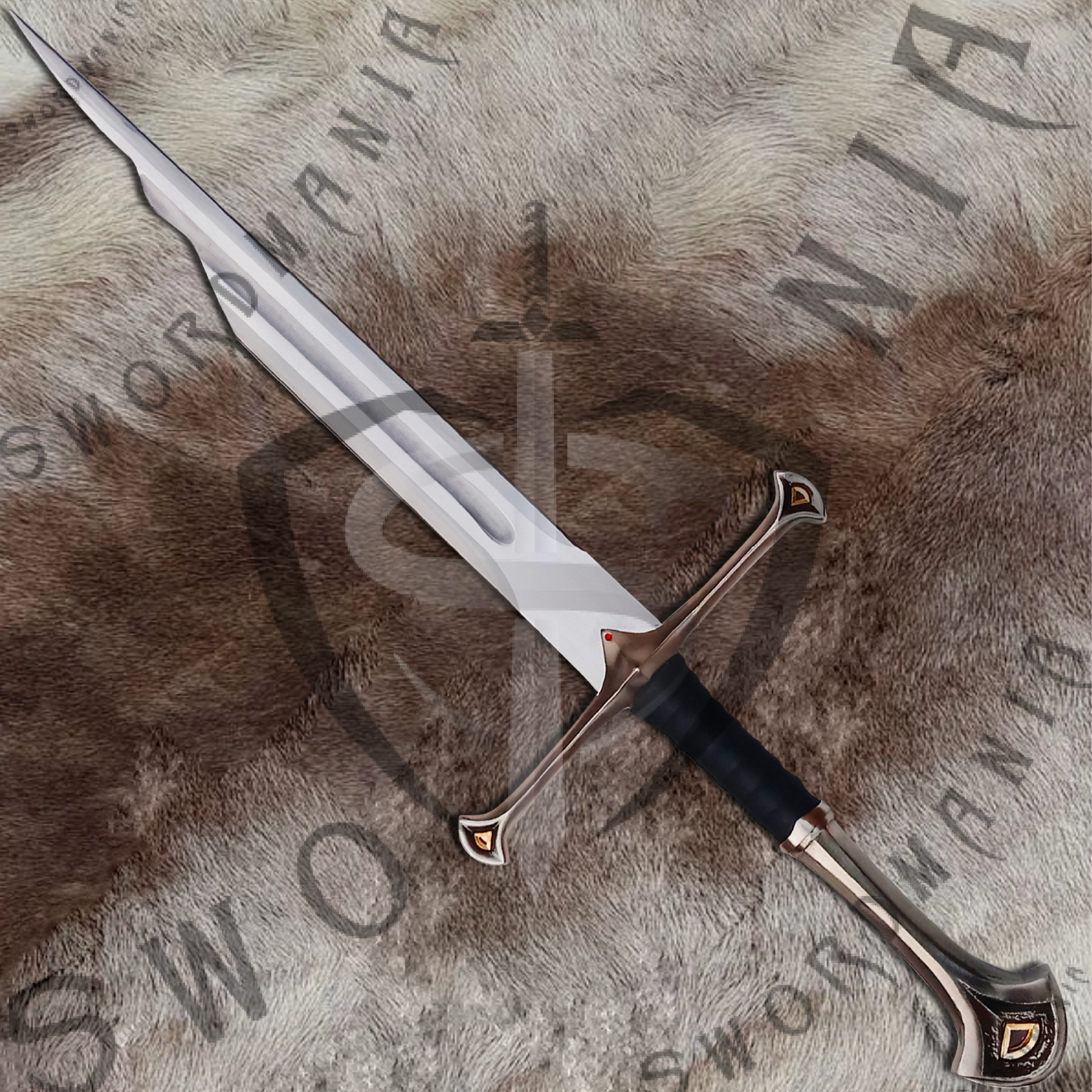 This is a full scale, 31inch Handle Shred of Narsil Sword, also called Broken Narsil Sword, from Lord of The Rings: Fellowship of Rings, a marvel of J.R.R.Tolkien, that has forged blade available in various steel types with cosplay style construction and functional style construction. The hilt additionally has elvish inscriptions on it to adore the high polish blade that pays homage to Elendil who was original owner of Narsil Sword, as depicted in FOTR. Elendil's Broken Sword has silk screen printed plaque and hand stitched pure leather sheath.