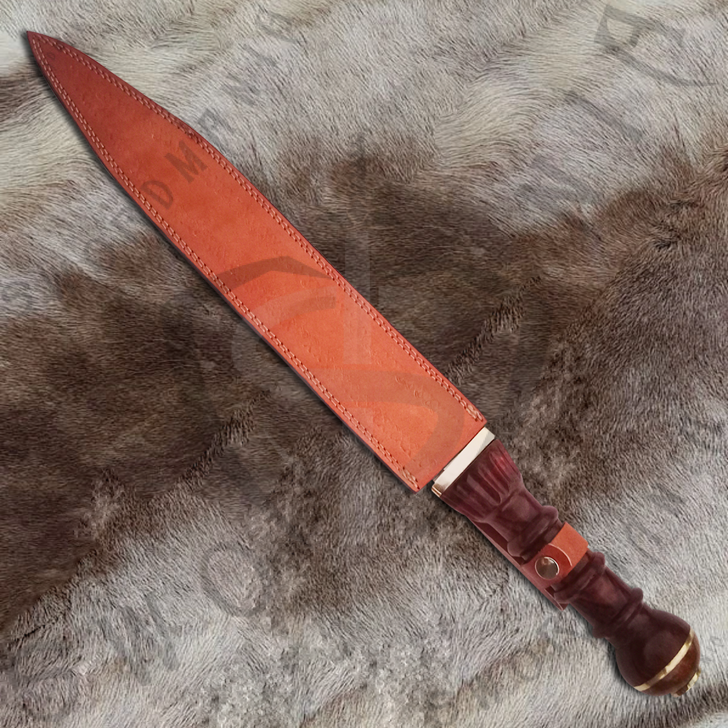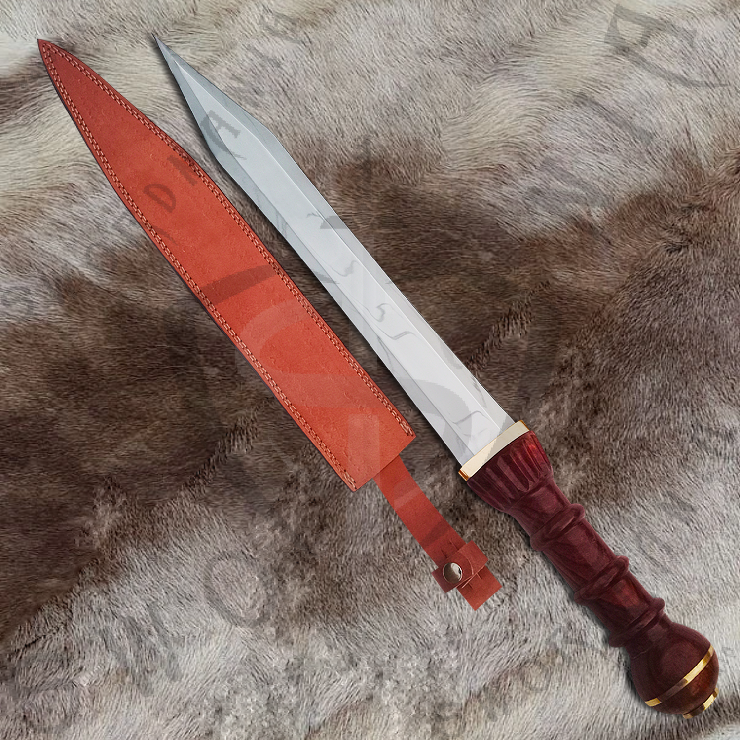 A true tribute to the strength and honor of Rome’s elite, this piece features a 23inch forged blade, available in Spring Steel or Damascus Steel. The blade is polished to a brilliant finish, highlighting the bold character of Maximus and the refined craftsmanship of the era. Its hilt is richly detailed in classic Roman style, while the handle is wrapped in premium leather for a firm, authentic grip.