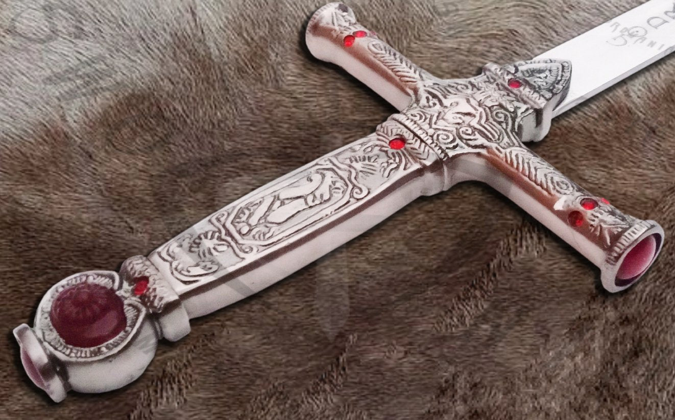 Step into the Wizarding World with a stunningly crafted full-scale metal replica of the Sword of Godric Gryffindor. Known for its resplendent design and powerful magical heritage, this legendary sword is a prized possession for collectors and Harry Potter enthusiasts alike. Measuring 42 inches in total length, the sword is forged from premium-grade steel, ensuring both beauty and durability. The intricately detailed silver-plated hilt is adorned with rubies, symbolizing Gryffindor's house colors and values of bravery and courage. The handle is both elegant and sturdy, making it suitable for display or light handling.