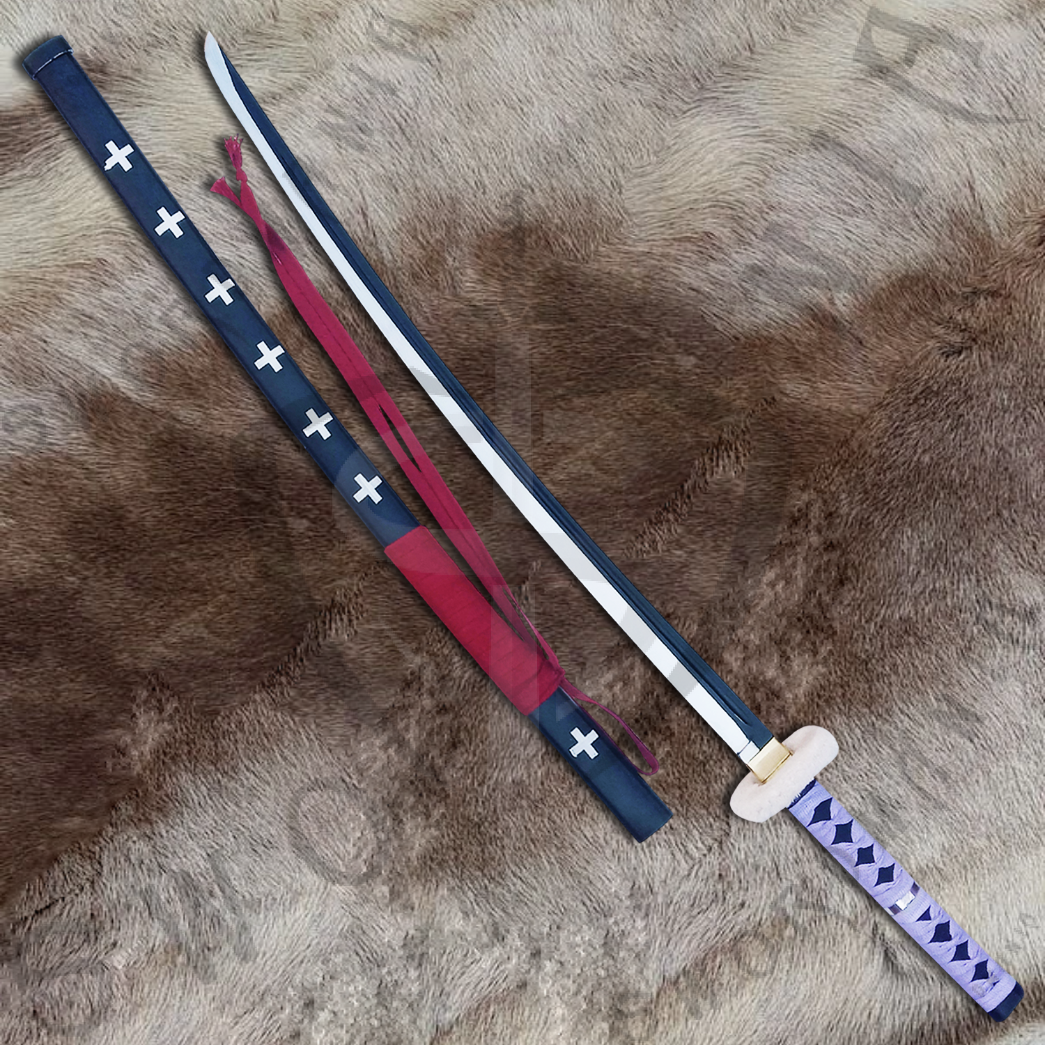 This is a full-scale 40inch replica of Kikoku, the mysterious and oversized nodachi carried by Trafalgar Law in One Piece. Featuring a 30inch forged steel edge and a 10inch traditionally wrapped handle, it’s offered in both functional and display-ready formats. The replica comes with a fur-lined black scabbard and a custom-crafted wooden plaque, capturing the cold precision and dark elegance that define Kikoku’s unforgettable presence.