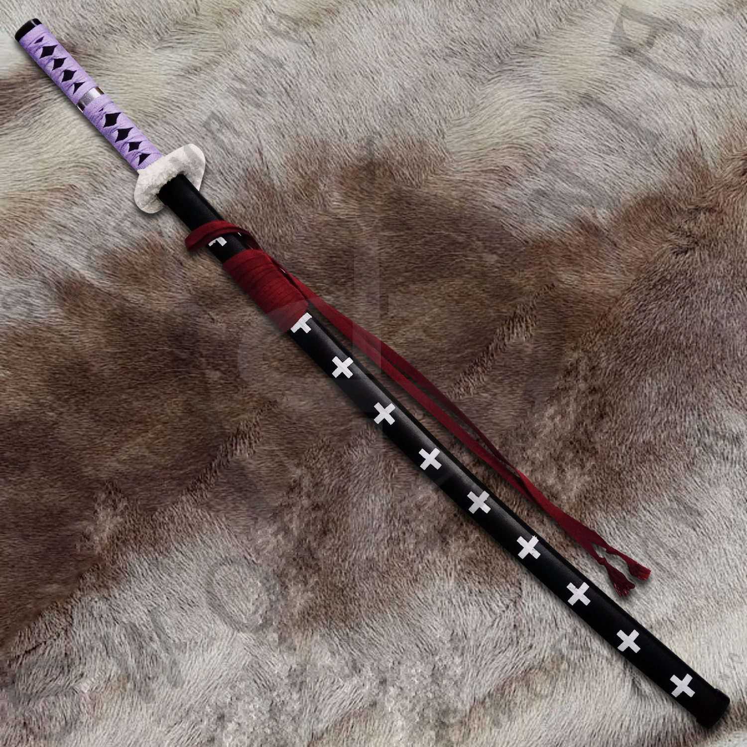 Channel the surgical precision of the Surgeon of Death with this full-scale replica of Kikoku, the signature blade carried by Trafalgar Law in One Piece. Forged with attention to detail and modeled after its anime and manga appearance, this 40inch recreation embodies the eerie control and silent threat Kikoku represents. The 30inch blade, finished in black steel with silver accents, is contrasted by a 10inch handle wrapped in traditional cord, topped with a white fluff pommel and cross-guard ring.
