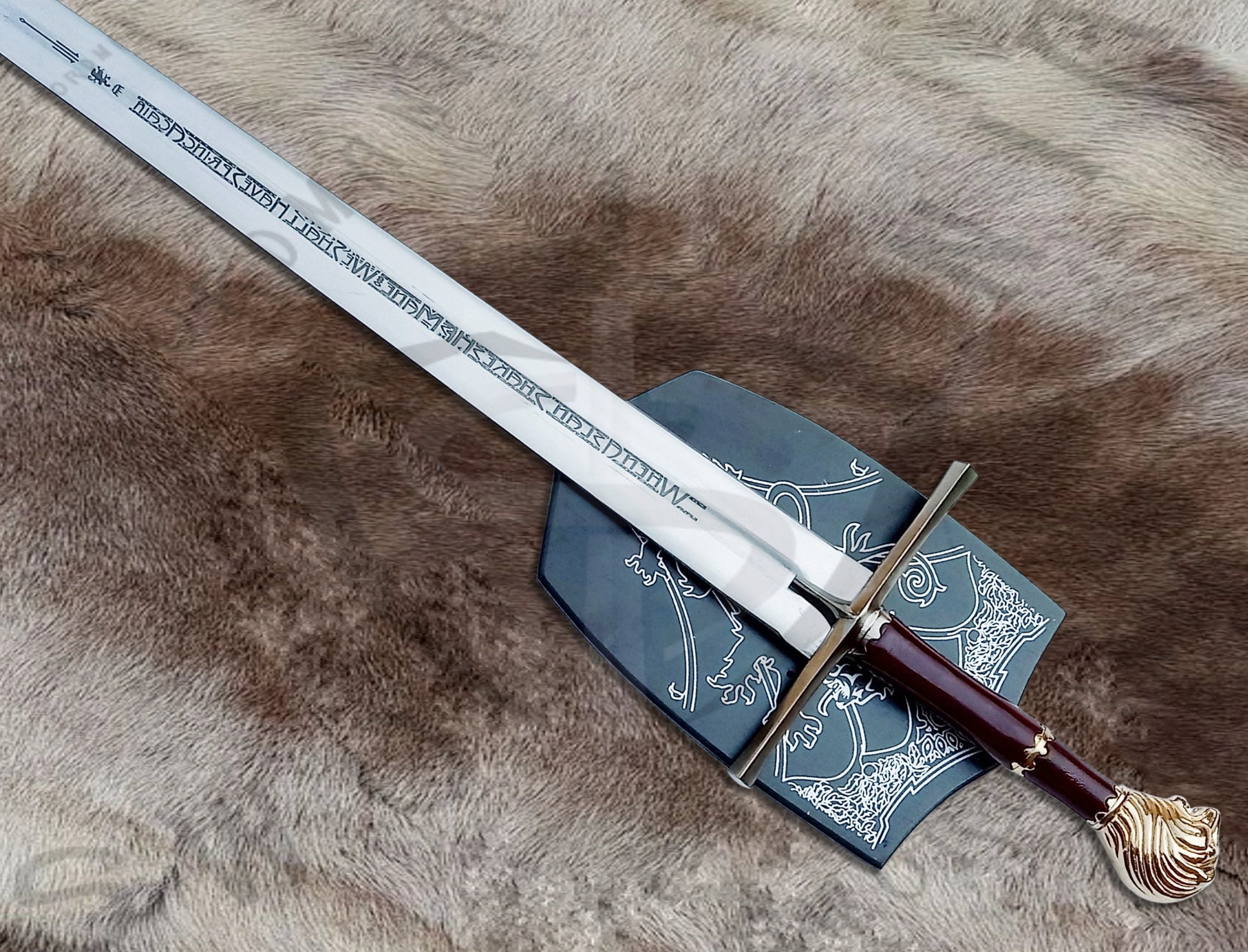 Rhindon is designed for both display and functional role play, offering variants crafted from durable materials like Spring Steel or Damascus Steel. This ensures it meets the expectations of collectors and fans alike, while staying true to the artistry of its origins. Accompanying the sword is display stand making it the perfect center piece for any collection.