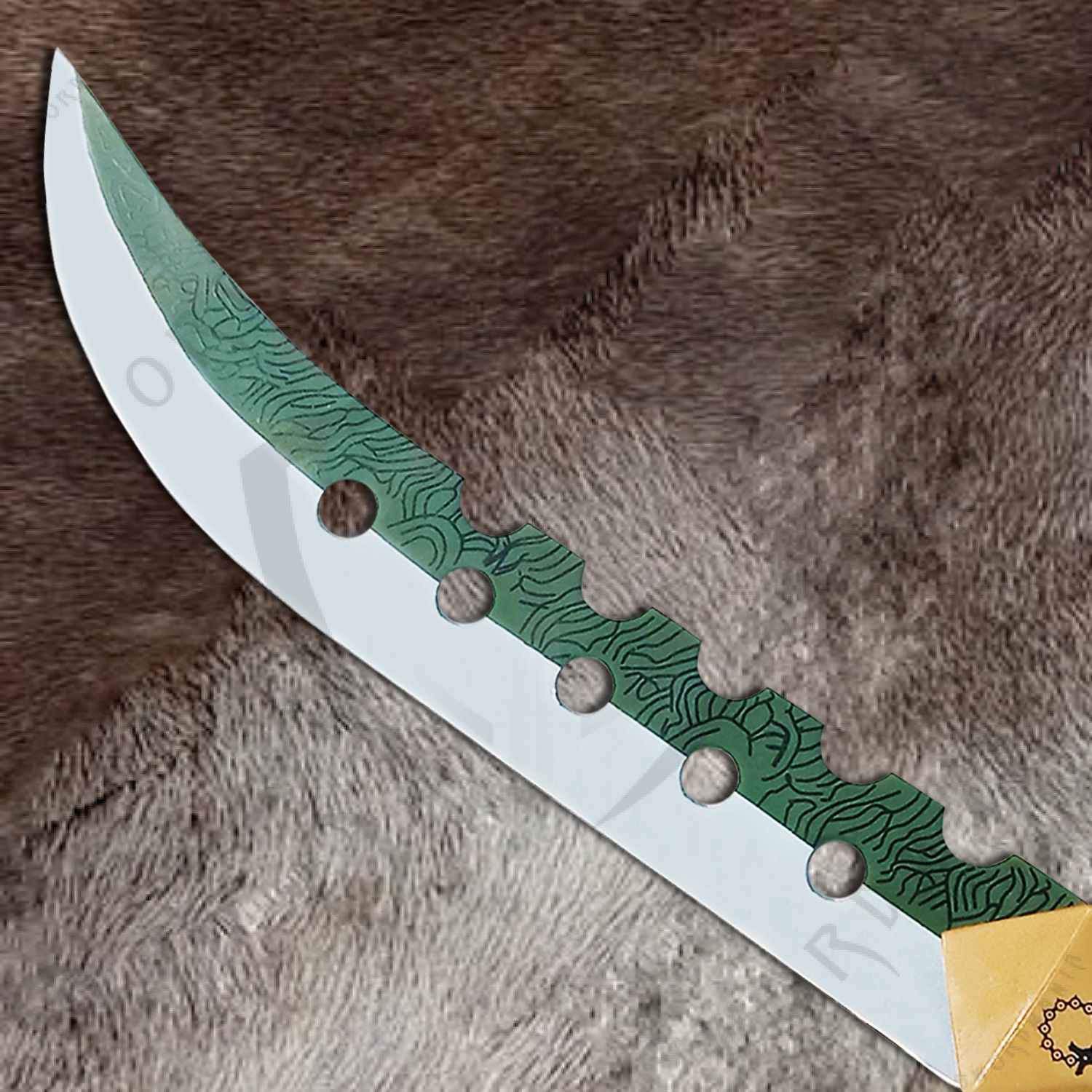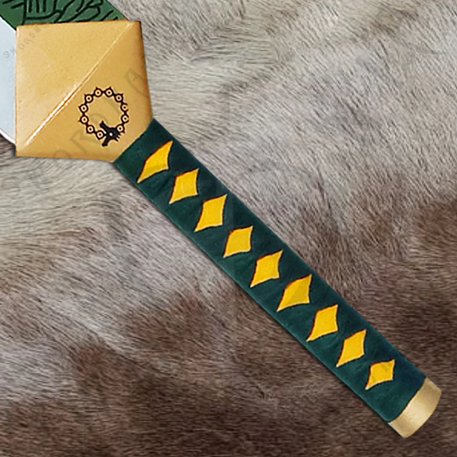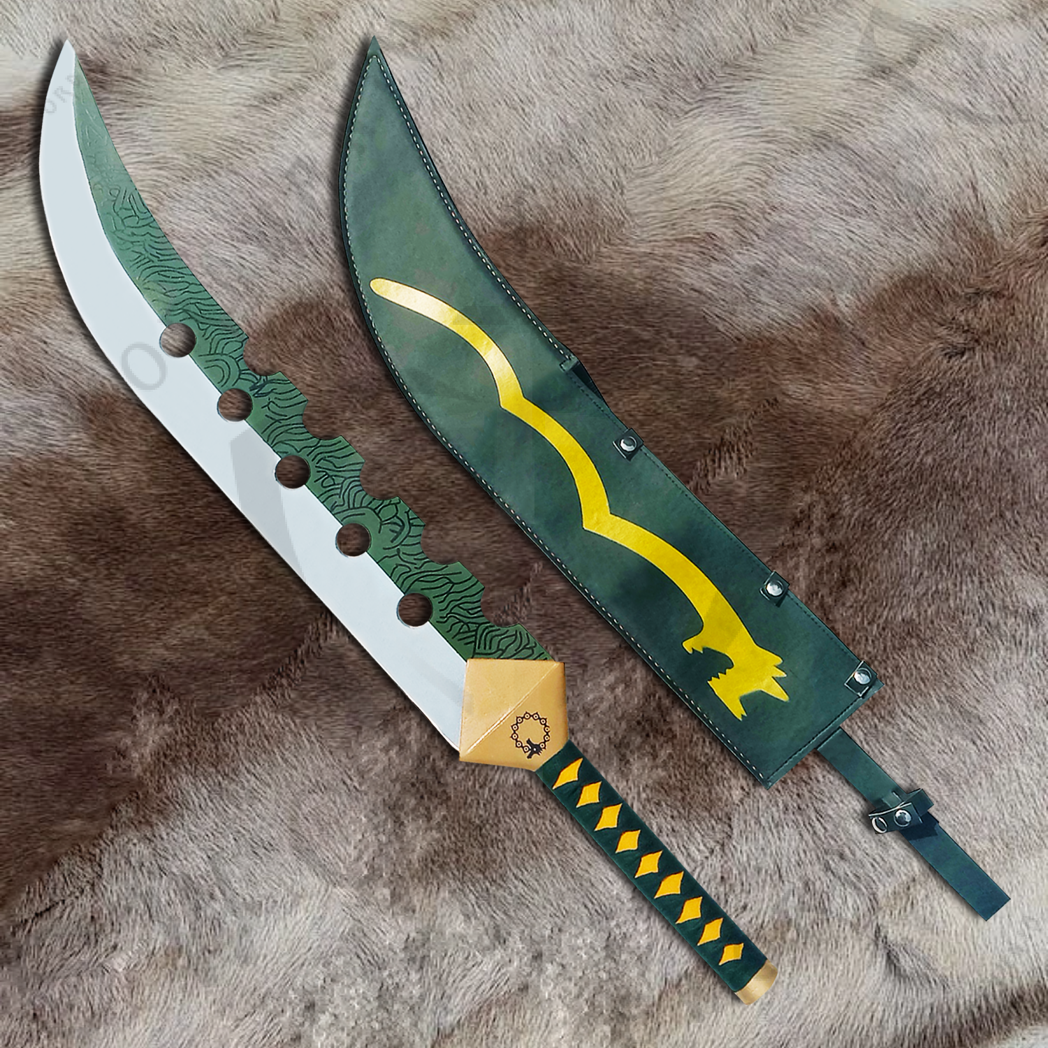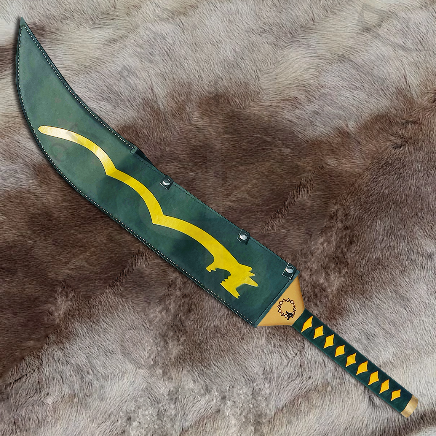 A tribute to Meliodas’s immense power and iconic presence, this replica features a 26inch forged blade, offered in Spring Steel or Damascus Steel. Its curved profile and polished finish reflect both elegance and raw force. The hilt is crafted with ornate detailing, echoing its anime counterpart, while the grip is wrapped in high-quality leather for an authentic, steady hold.