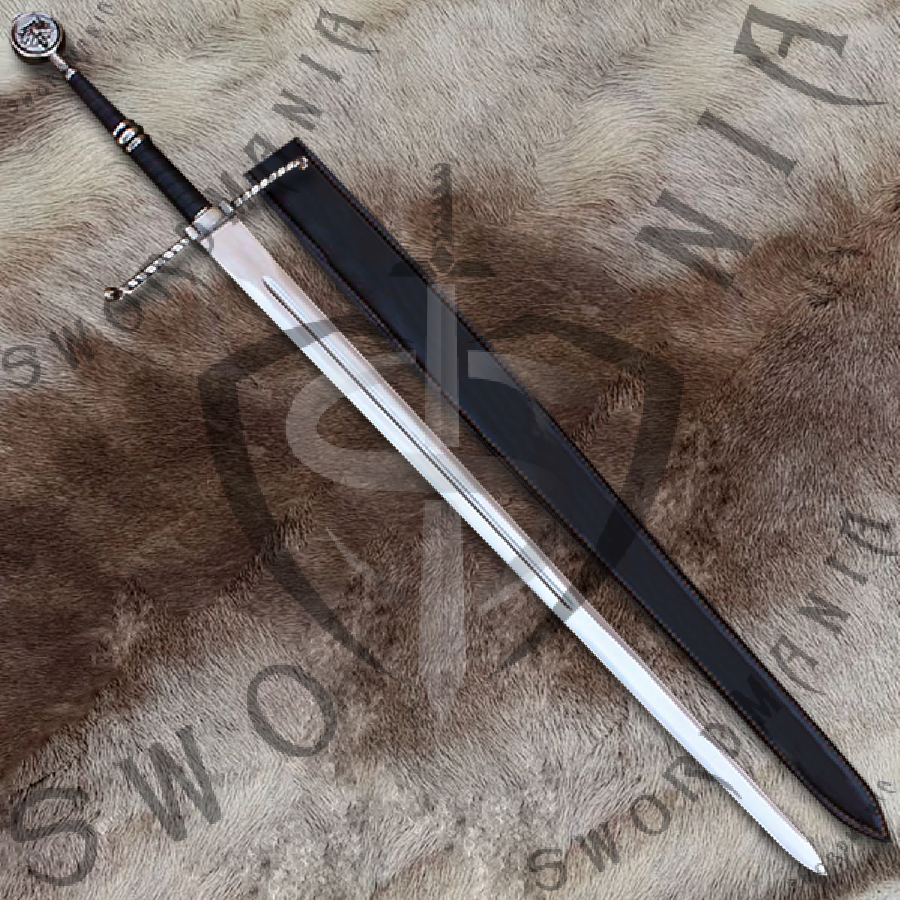 The Bremervoord Silver Sword which was features a striking design and an enchanting blend of Witchers' craftsmanship and their acumen bravery. It is 45inches in total length Forged from the finest steel and imbued with arcane rituals. The 34-inch blade boasts a mirror-polished finish, adorned with intricate runes that form consistency with the runes of guard paying homage to its origin and purpose.