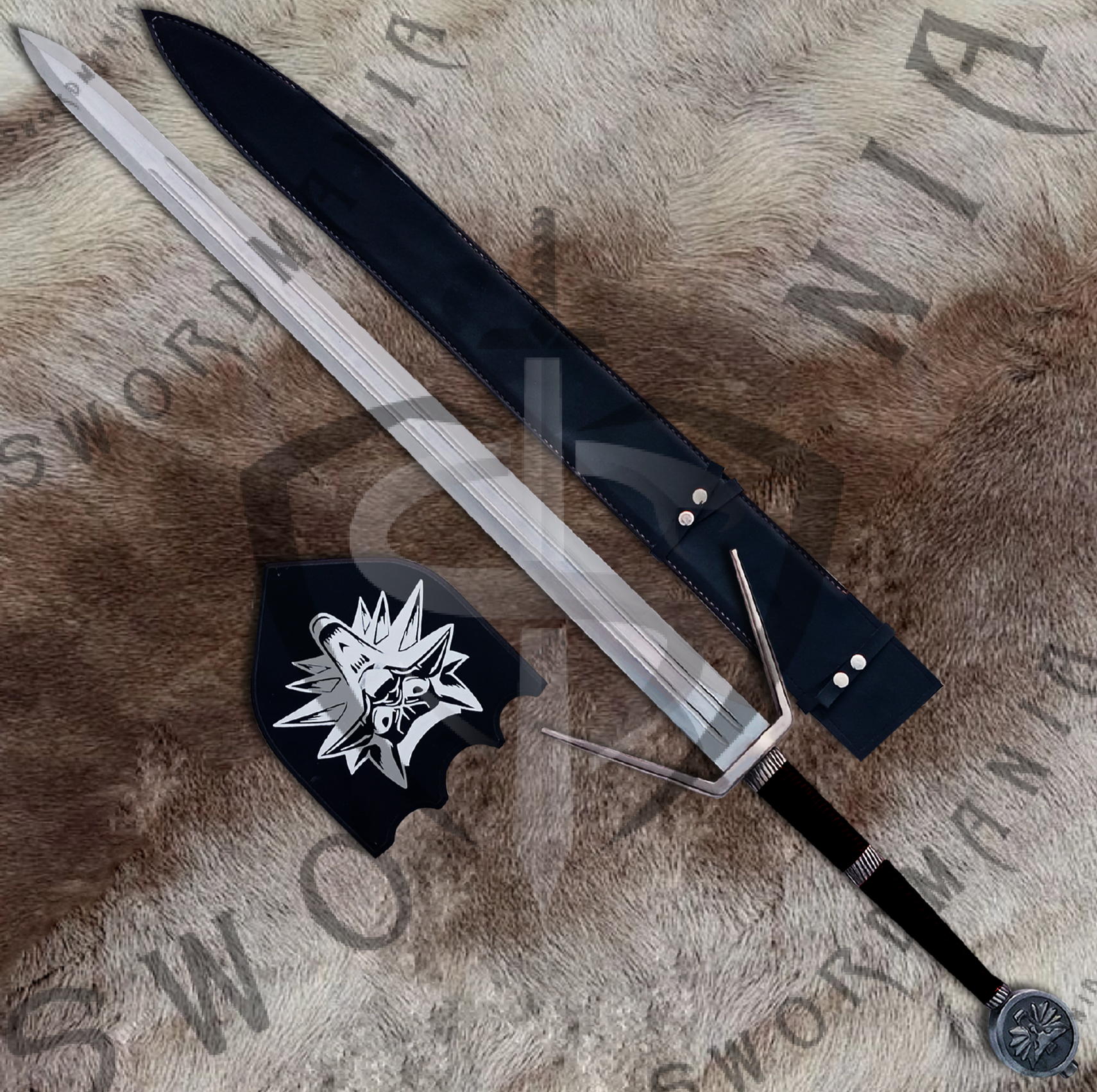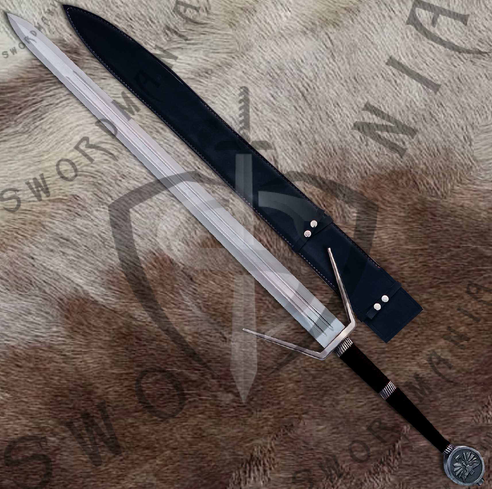 This is a full scale, 45inch Feline Silver Sword of Geralt of Rivia from The Witcher series, a marvel of Andrzej Sapkowski, that has forged blade available in various steel types with cosplay style construction and functional style construction. The hilt additionally has runes on it to commensurate the runes on the blade, a characteristic identity of Silver swords of Geralt. Witcher's Sword has silk screen printed plaque and leather scabbard that is hand stitched, further adorned by the casted fittings.