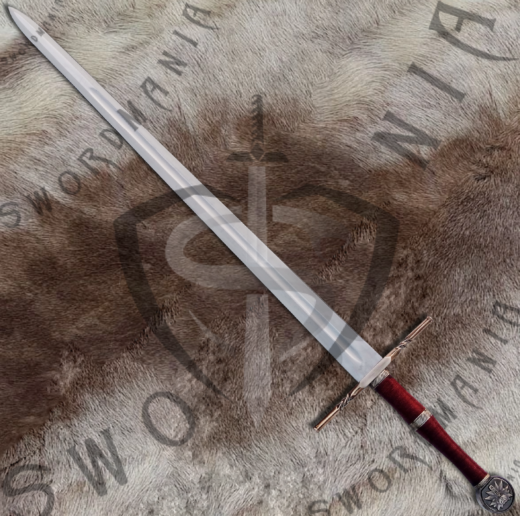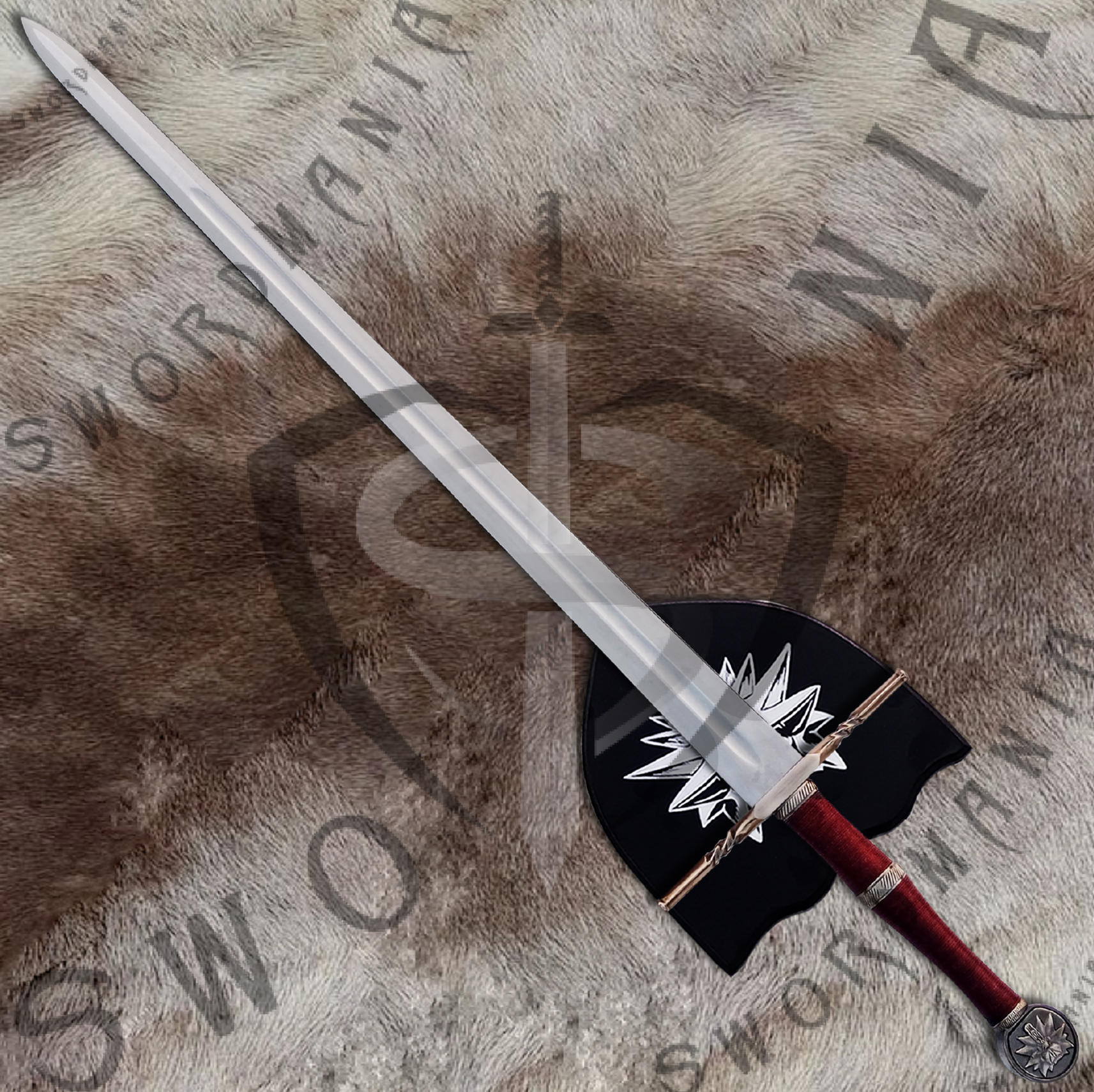 The Steel Sword of Witcher is a prized possession of The Steward of Ciri (along with Yennifer) which was features a striking design and an enchanting blend of Witchers' craftsmanship and their acumen bravery. It is 43inches in total length Forged from the finest steel and imbued with arcane rituals. The 32-inch blade boasts a mirror-polished finish, adorned with intricate runes that form consistency with the runes of guard paying homage to its origin and purpose.