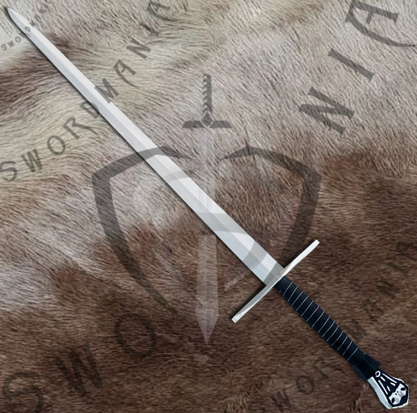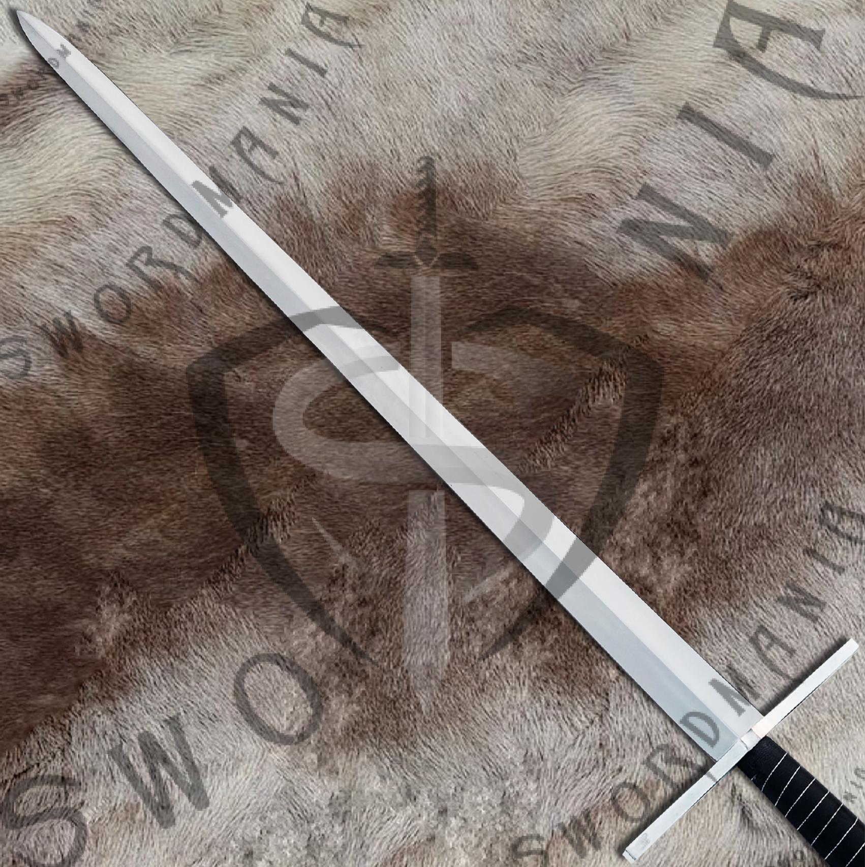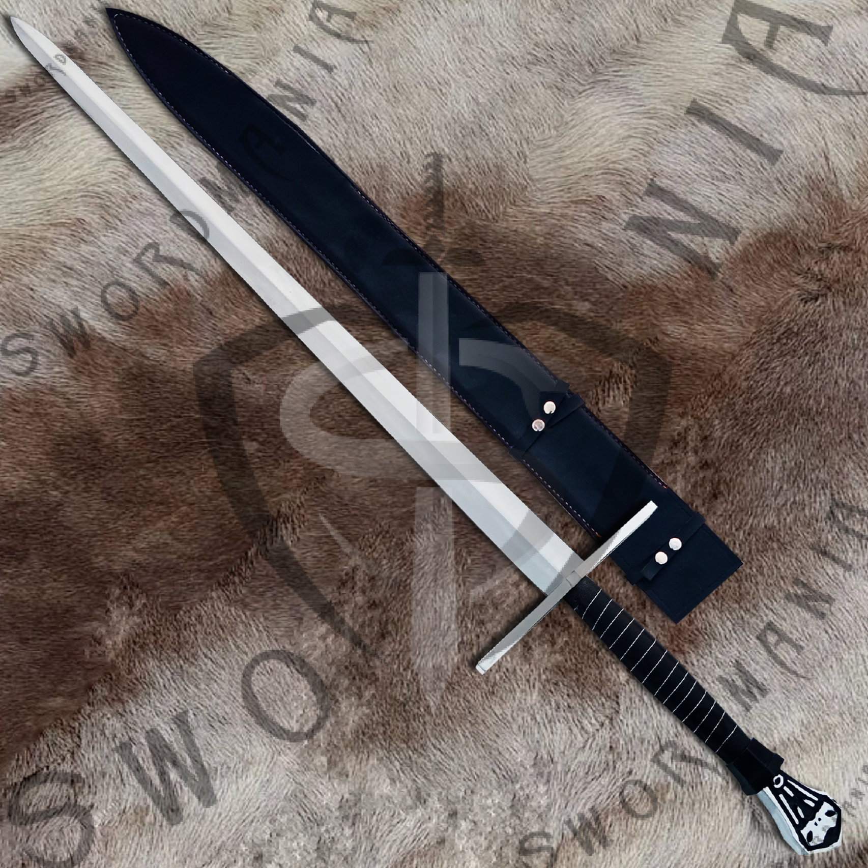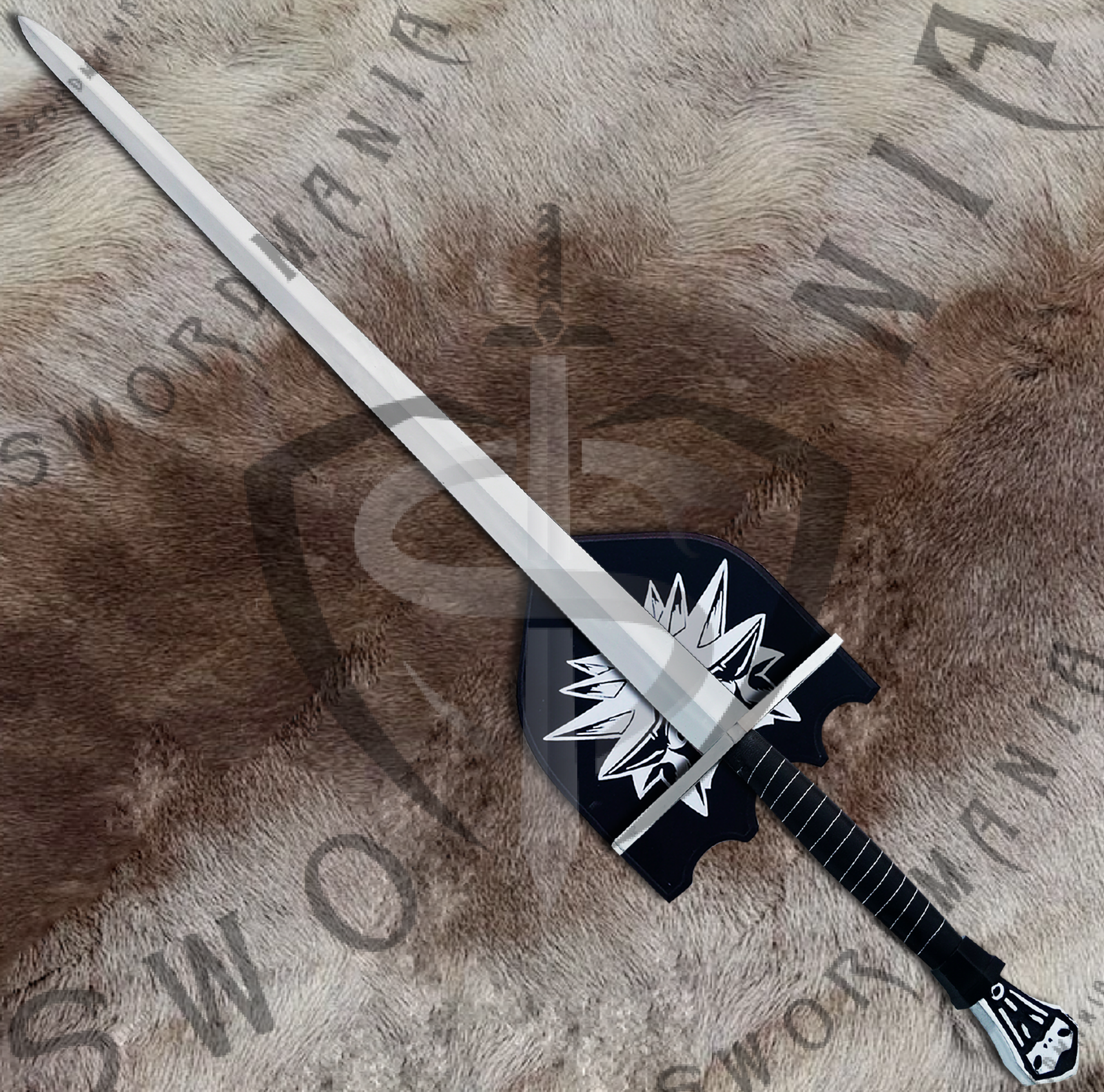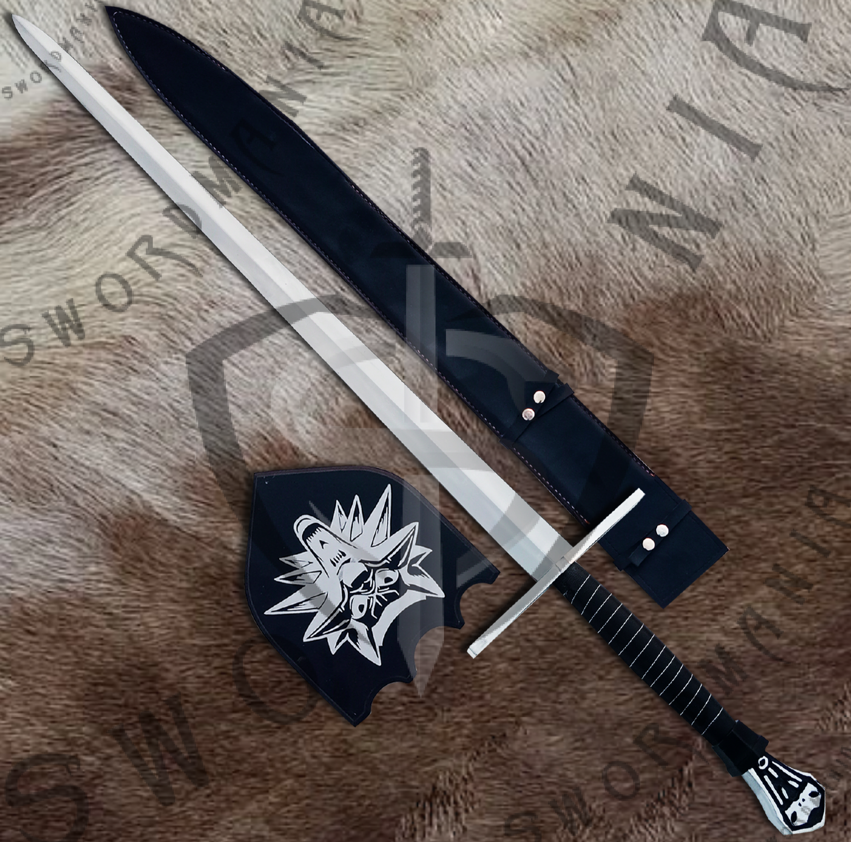 This is a full scale, 45inch Viper Sword of Geralt of Rivia from The Witcher series, a marvel of Andrzej Sapkowski, that has forged blade available in various steel types with cosplay style construction and functional style construction. The hilt additionally has runes on it to commensurate the runes on the blade, a characteristic identity of Silver swords of Geralt. Witcher's Sword has silk screen printed plaque and leather scabbard that is hand stitched, further adorned by the casted fittings.