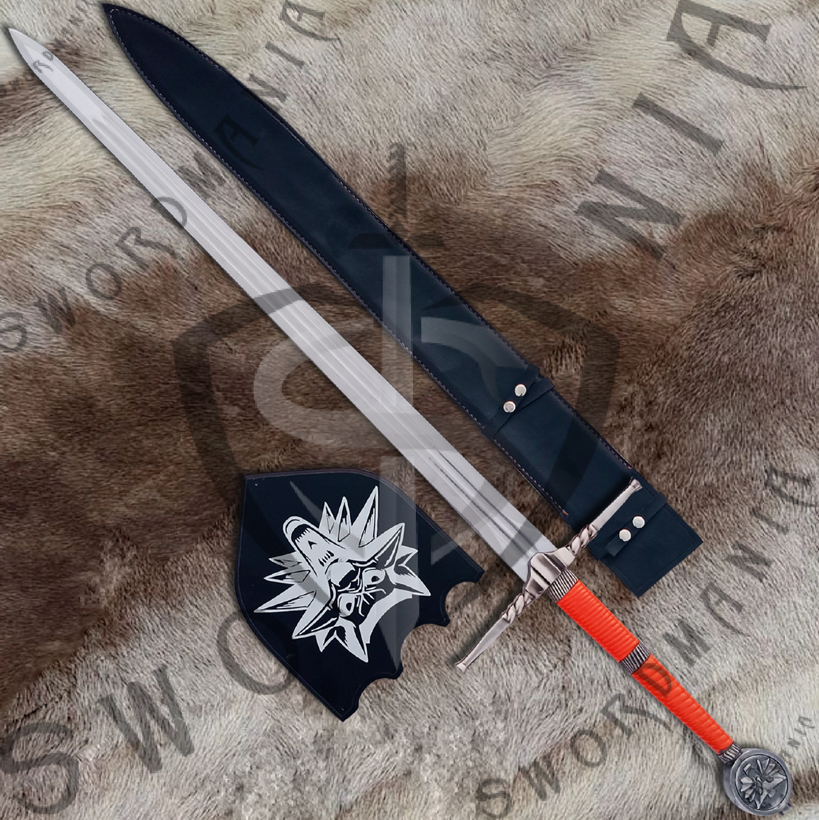This is a full scale, 45inch Steel Sword of Geralt of Rivia from The Witcher series, a marvel of Andrzej Sapkowski, that has forged blade available in various steel types with cosplay style construction and functional style construction. The hilt additionally has runes on it to commensurate the runes on the blade, a characteristic identity of Silver swords of Geralt. Witcher's Sword has silk screen printed plaque and leather scabbard that is hand stitched, further adorned by the casted fittings.